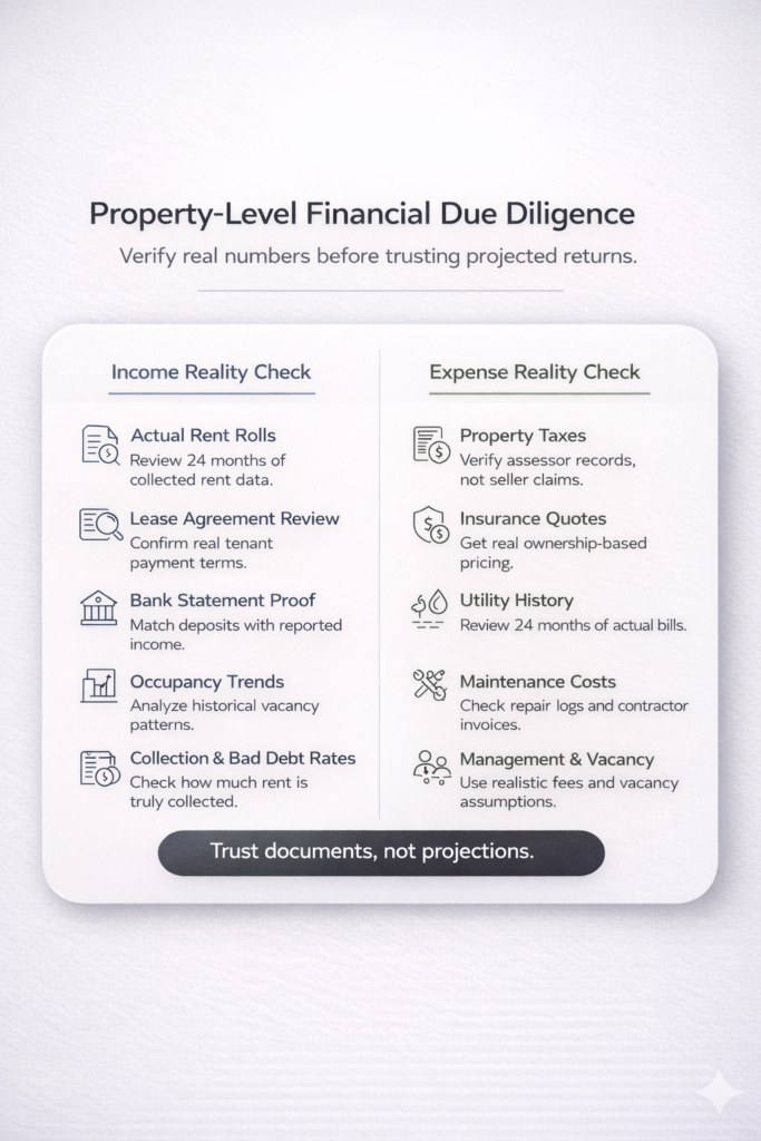 Sellers and syndicators often present pro forma income statements showing ideal scenarios. Your job is to verify actual performance with documentation.